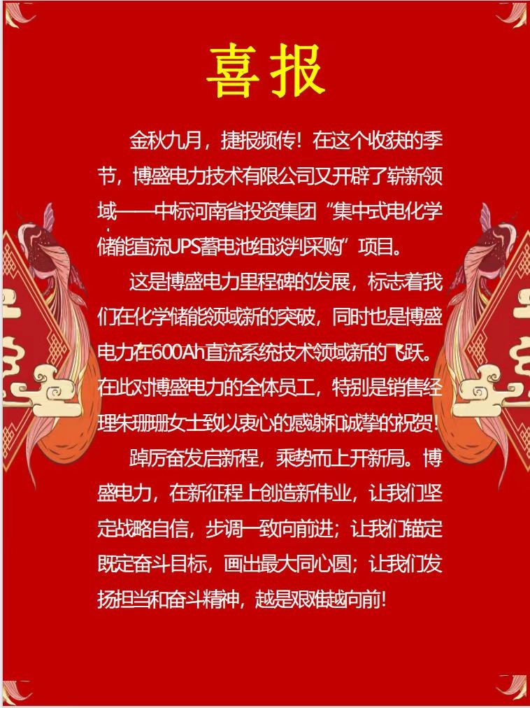 金秋九月,捷報(bào)頻傳!在這個(gè)收獲的季節(jié),博盛電力技術(shù)有限公司又開辟了嶄新領(lǐng)域——中標(biāo)河南省投資集團(tuán)集中式電化學(xué)儲(chǔ)能直流UPS蓄電
